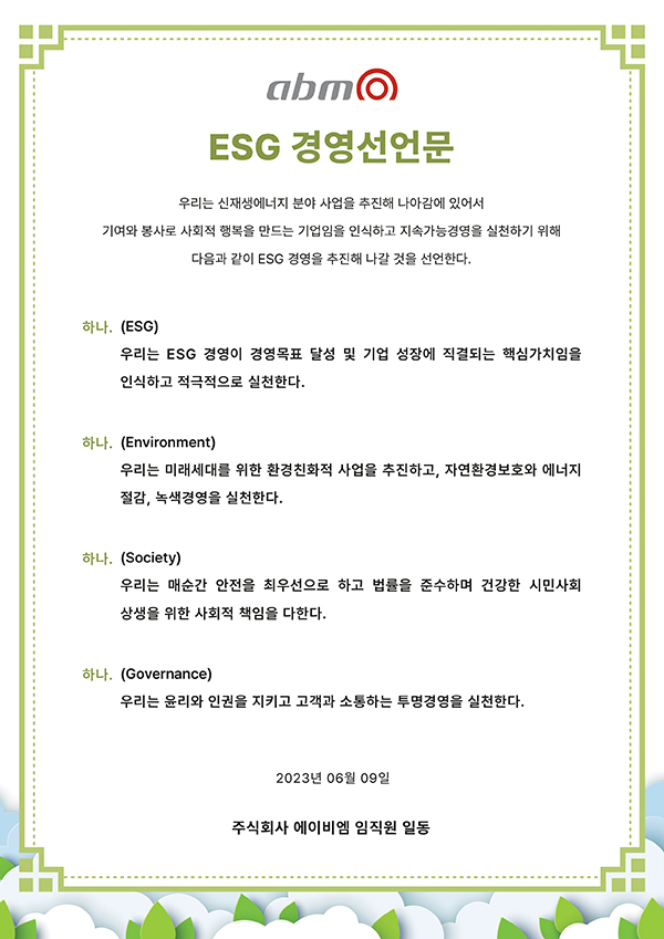 2023년 6월 9일, (주)에이비엠 ESG 경영선언문