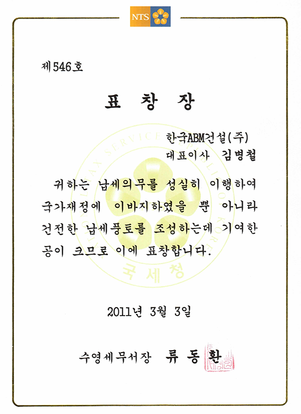 Commissioner of Suyeong Tax Office's Commendation Letter 2024-12-06 Major Awards 0 953 2024.12.06 14:08 No. 546